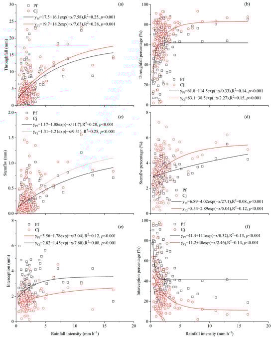 Rainfall partitioning and its relationship with rainfall intensity for P. fruticosa and C. jubata. (a) Throughfall (TF), (b) Stemflow (SF), (c) Interception (IC), (d) Throughfall percentage (TF%), (e) Stemflow percentage (SF%), and (f) Interception percentage (IC%).