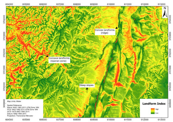 A landform index [18] GIS database was developed to represent a simple topographic measure as a proxy for the effect of landform on the distribution and composition of forest vegetation and for site productivity. The landform index was based on the average ground slope in eight directions. A ground slope map based on the DTM was used to create the landform map. While the original index values theoretically range from −1.0 to 1.0, they were stretched to a range of 0 to 255 to better highlight differences across the landscape (Figure 3). Generally, higher values correspond to concave landforms, such as valleys and coves, whereas lower values often indicate convex features, such as ridges and saddles, depending on the slope gradient.
