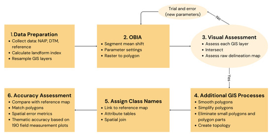 The objective of this study is to develop a semi-automated methodological pipeline for producing stand maps for a broad, structurally complex forest in northern Alabama (USA). The process utilizes orthophotographs and landscape topographic features with the motivation of producing a stand boundary database that will support forest management planning efforts. We aim to fill a research gap by identifying an appropriate combination of input datasets, segmentation algorithms, parameter values, and GIS procedures applicable to natural oak-hickory-pine systems. The rest of the manuscript is structured into six main sections: Section 2 describes the study area, data sources, and preprocessing steps. Section 3 details the OBIA method, mean shift segmentation algorithm, GIS post-processing steps, and accuracy assessment approach. Section 4 presents the outcomes of the stand delineation process, including spatial and thematic accuracy, and compares automated versus reference maps. Section 5 interprets the findings, compares them with previous studies, and highlights challenges in automation. Finally, Section 6 summarizes key findings, emphasizes the potential of semi-automated stand delineation, and outlines future research directions.