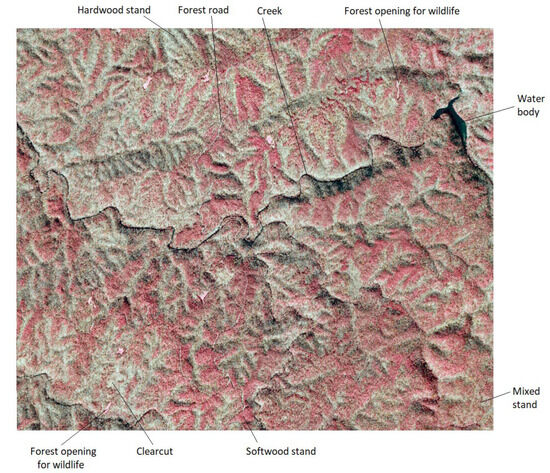 A representative color-infrared orthophotograph subsample of the Talladega National Forest exhibiting several land-cover types (Source: U.S. Department of Agriculture National Agricultural Imagery Program (NAIP)).