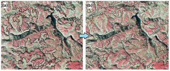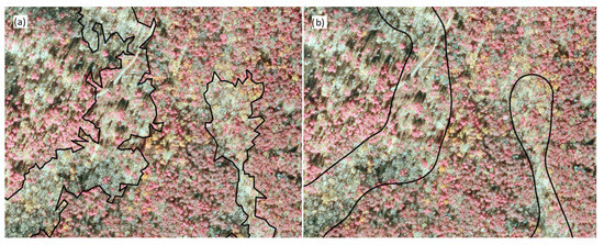 (a) Zig-zagged stand boundaries; (b) the same boundaries after the smoothing process in GIS.