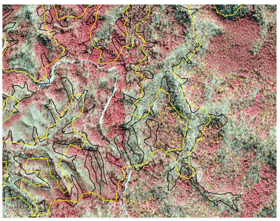 Polygon simplification process in GIS. The original OBIA-developed stand delineation is shown in black, while the simplified polygons are shown in yellow.