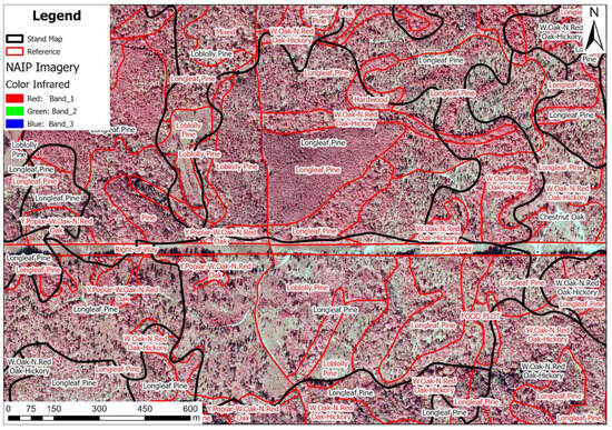 In the field of forestry, management decisions are typically applied to stands of trees rather than to individual trees. A stand serves as the basic operational unit where various management practices, such as clearcutting, regeneration, and prescribed burning, are implemented [1,2]. A forest stand is defined as a contiguous community of trees, usually uniform in species composition and biophysical characteristics, such as canopy height, layering, and timber quality, which distinguish it from neighboring stands. At times, roads, streams, ridgelines, ownership boundaries, and other natural and anthropogenic features define the boundary of a stand of trees. Further, a stand may have a minimum or maximum size that adheres to data management and operational practice protocols. In this context, a forested landscape can be viewed as a mosaic of thousands of individual stands, and effective forest management significantly relies on maintaining up-to-date stand maps to catalogue composition and structure, guiding management actions.