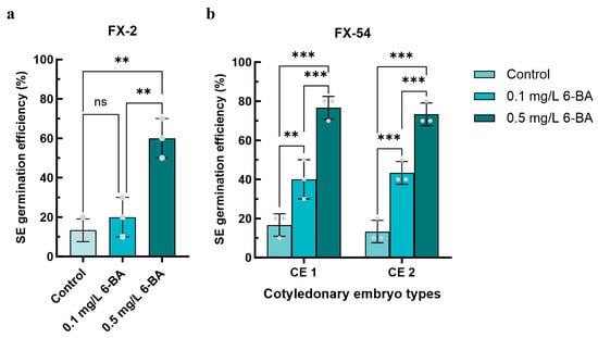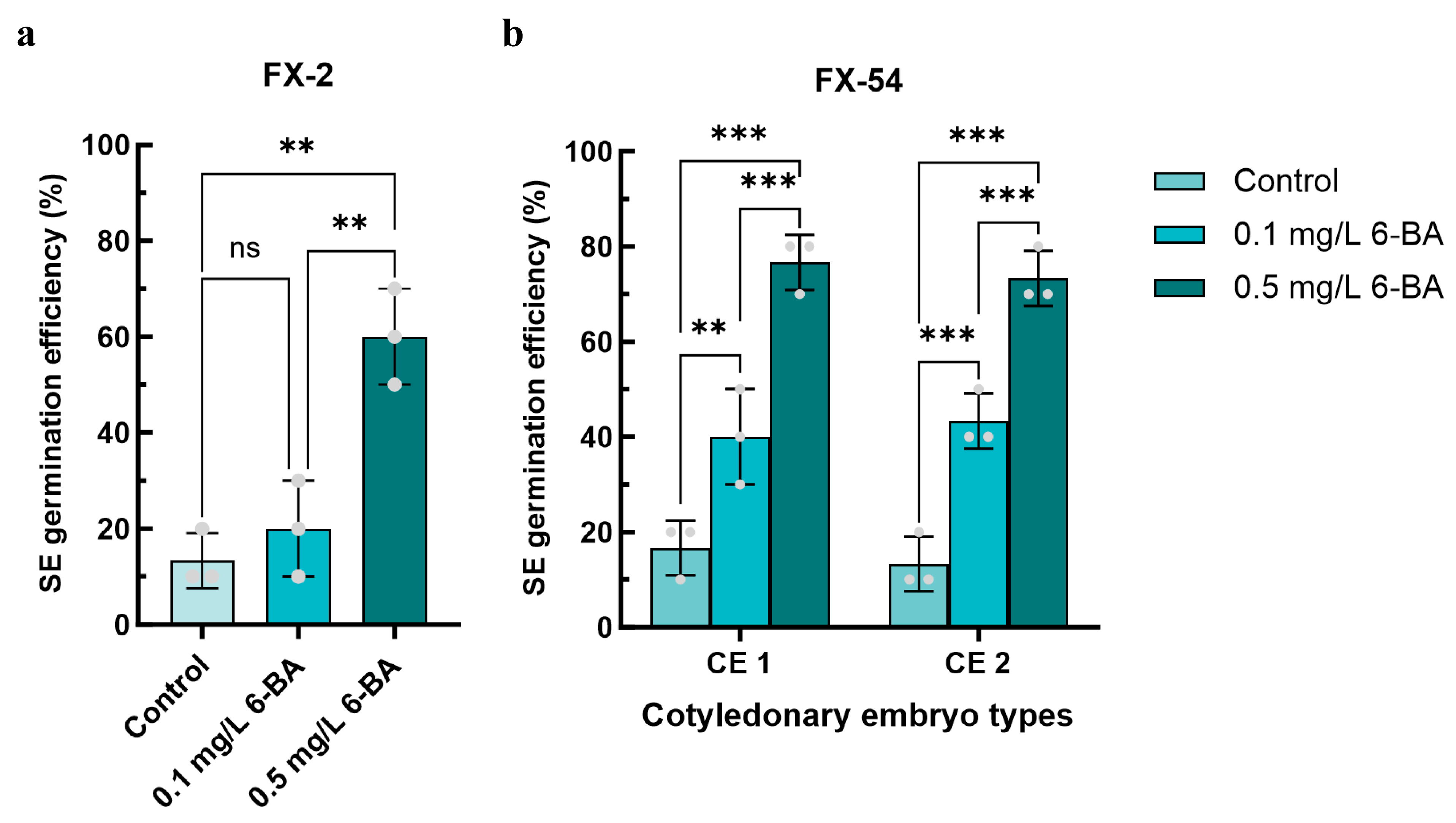 3.4. Effect of 6-BA on Somatic Embryo Germination into Seedlings