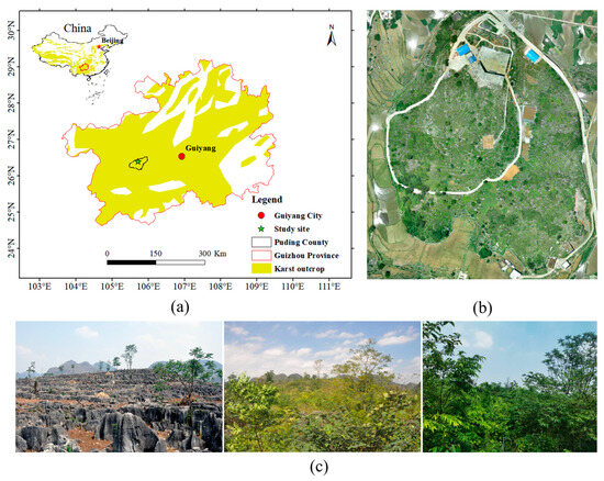 Southwest China is one of the three largest contiguous karst areas in the world [1], with about 426,000 km2 of exposed carbonate rocks [2]. Water and nutrient conditions are limited due to a high rock exposure ratio and a low amount of soil [3] in the area compared with the non-karst areas [4,5,6]. At the same time, soils in karst areas are generally characterized by high pH and high calcium and magnesium content [7,8,9,10], which are stressful conditions for vegetation growth. As a result, the net primary productivity and biomass of vegetation in the karst region of Southwest China are significantly lower than those of non-karst areas in the same climatic zone [11,12,13,14].