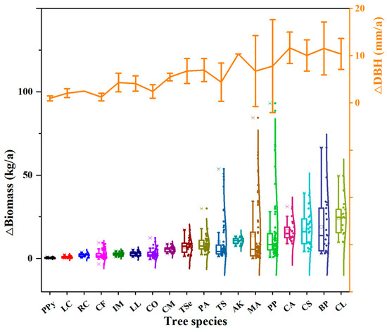 Intraspecific variability was particularly pronounced in DBH and biomass accumulation too (Figure 2; Table 2). The largest differences were found in Platyosprion platycarpum (PP), Melia azedarach (MA), and Broussonetia papyrifera (BP) (Figure 2); the difference between the maximum and minimum biomass accumulation of individuals reached 92.33, 84.43, and 63.63 kg/a, respectively. The species with the smallest difference in biomass growth among plants was Pyrus pyrifolia (PPy), with a difference of only 0.98 kg/a.