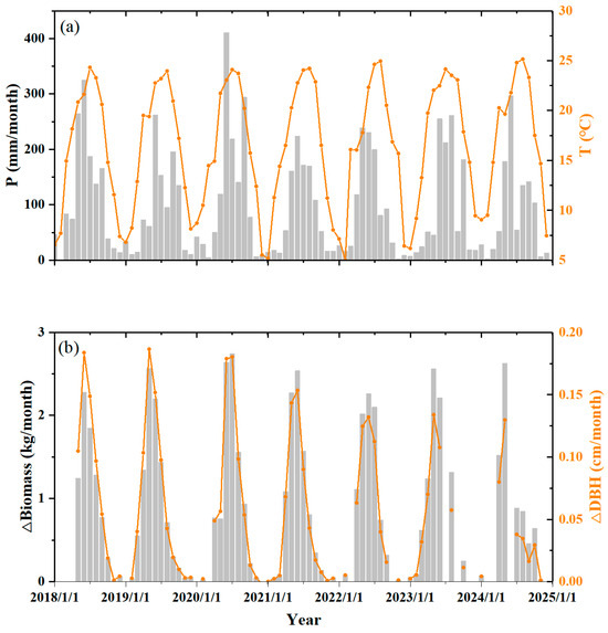 Seasonal variations in tree growth along with climate: (a) monthly precipitation (P) and monthly mean air temperature (T); (b) monthly mean biomass accumulation (ΔBiomass) and monthly mean DBH increment (ΔDBH).