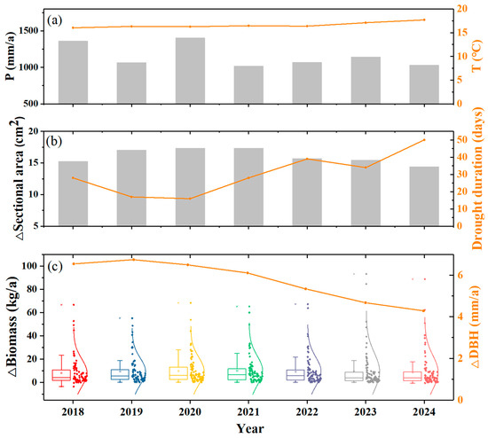Interannual variations in tree growth along with climate: (a) annual precipitation and annual mean air temperature; (b) annual mean sectional area change and drought duration; (c) annual biomass accumulation for each tree and annual mean DBH increment.