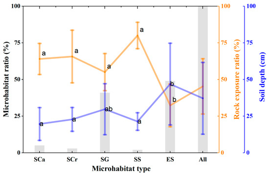 Distribution of microhabitats (SCa: stone cavern; SCr: stone crevices; SG: stone gully; SS: stone surface; ES: earthy surface). Different letters indicate significant differences (p < 0.05) between microhabitat types.