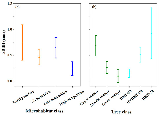 Biomass was estimated using allometric equations established from comparable regions adjacent to the study area [30]. When species-specific equations were unavailable, generalized allometric equations (Table 1) were applied. The change in the cross-sectional area of each individual tree was calculated as the difference in circular area derived from successive DBH measurements (assuming stem circularity). Statistical analyses were conducted to examine the temporal dynamics and environmental drivers of biomass and DBH increments. Both monthly and annual variations in biomass and DBH were quantified, and interspecific differences in biomass accumulation were assessed using one-way ANOVA tests. Multiple regression models were used to evaluate the synergistic effects of microhabitat parameters on tree growth. The impact of drought duration during the growing season on the annual DBH change was analyzed through Pearson linear correlation analyses. The relationship between microhabitat conditions and tree growth was further explored by classifying 63 selected trees (excluding dead trees, parasitized trees, and trees located at site boundaries to minimize edge effects). Mean annual DBH increments (ΔDBH) across different microhabitat categories were compared. “Stone surface” represents all kinds of microhabitat surfaces except earthy surfaces. Competition intensity was categorized as high or low based on the sum of the DBH of neighboring trees within a 3 m radius, using a threshold of 90 cm determined by prior sensitivity analyses. Data processing utilized Microsoft Excel 2007 (Microsoft, Redmond, USA), statistical analyses (correlation and ANOVA) were performed in SPSS PASW Statistics 18 (IBM, Chicago, IL, USA), and figures were generated using Origin 2021 (OriginLab, Northampton, MA, USA).