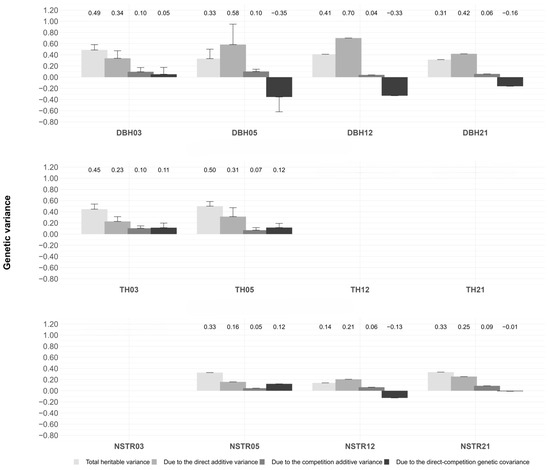 Mean relative contributions of the variances of direct and competition genetic effects, as well as their covariance (direct-competition genetic covariance), to the total heritable variance for all traits and ages evaluated, expressed as a proportion of the phenotypic variance. The traits diameter at breast height (DBH), total tree height (TH), and the normal score for stem straightness (NSTR) are followed by a number denoting the age of measurement in years. Results are based on all statistically significant (p < 0.05) spatial-competition (Spa-Comp) models. Error bars represent mean standard errors, and mean contributions are shown above each bar.