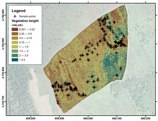 Accuracy was evaluated by comparing the estimated and measured values for the 204 points collected in the field. Field measurements were carried out during the non-growing period before the 13 February 2019 flight, with the aim of capturing the variety in vegetation heights in the study area. The height measurements from the 204 sample points ranged from 0 (bare ground) to 340 cm, with a mean value of 82 cm (s.d. 55.01 cm).
