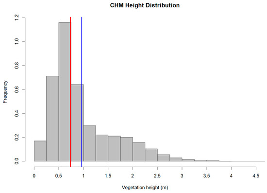 Distribution of shrub height in the study area according to the results of the CHM (frequencies expressed in pixels × 106). Blue and red lines represent the mean and median values, respectively.