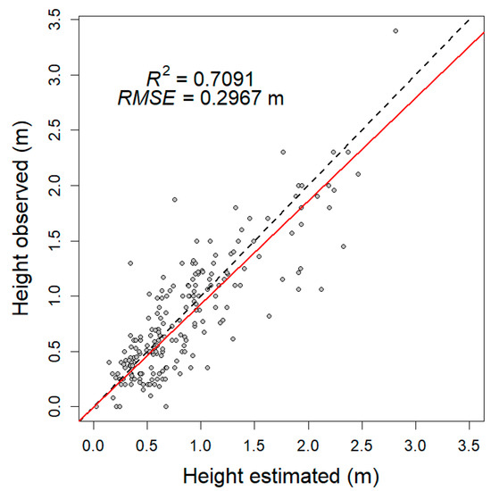 The observed heights were plotted against the estimated values for the 204 field sampling points (Figure 4). The fitted linear model explains about 71% of the observed variability, with a root mean square error value of less than 0.3 m, representing around 36% of the measured height average. This model shows a slight tendency to overestimate height values above 0.75 m, although the value of the mean error (−0.039 m) seems to indicate a low level of bias.