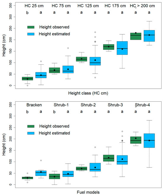 Box plots of observed and estimated vegetation heights for height classes (upper) and for fuel models (lower). Different letters (a, b) indicate significant differences between mean values (α = 5%) for each class or model. Black dots represent mean values.