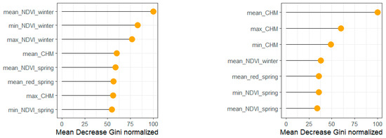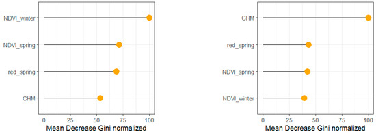 The results of the cross-validation provided an overall accuracy of 91.13%, with a Kappa index of 0.88, and the most important features in the RF model were, in order of reduction in the Gini impurity value, the NDVI values of the winter and spring flights, the reflectance of the red band of the spring flight, and the height estimated with the CHM (Figure 6, left).