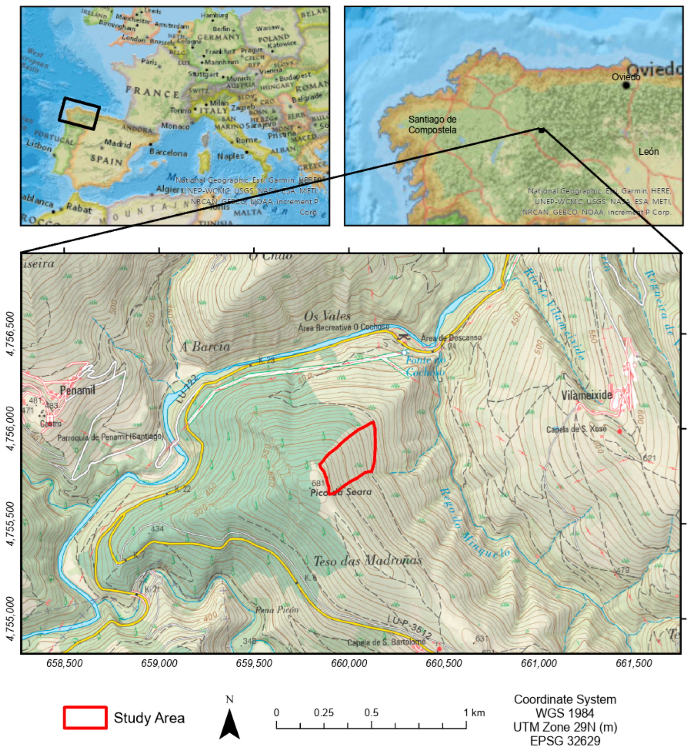 The experiments were conducted in February 2019 in an area of 6.16 ha included in a plot burned by prescribed fire. The study area is located in the Serra de Ancares (Galicia, NW Spain, Figure 1) on a northeast slope of elevation ranging from 500 to 680 m.a.s.l. (the highest area in the SW of the slope and the lowest area in the NE). The slope percentages are quite evenly distributed, varying from 40% to 55% (mean 47%), with a few locations reaching slopes of up to 70% around several rocky ridges in the SW of the plot. As the area was included in a program of prescribed burns, a strip surrounding the area underwent the mechanical clearing of woody biomass to minimize the risk of wildfire spread during burning.
