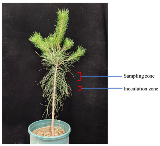 Three-year-old seedlings of P. tabuliformis were planted in soil-based pots (25 cm × 25 cm) and watered twice a week. The B. xylophilus strain BxFC, obtained from susceptible P. koraiensis plants, was preserved on PDA medium with Botrytis cinerea. The nematode suspension was prepared with sterile water at a concentration of 10,000 worms/mL. When performing the inoculation, a 1–2 cm wound was made vertically on the xylem at 1/3 height of the plant. The nematode suspension (200 μL) was injected into the wound, stuffed with sterile cotton, and wrapped with a sealing film (Figure 1). The plants grew in the greenhouse for 30 d. The stems and leaves, 2 cm up the inoculation zone, were sampled for the transcriptome sequencing and the physiological index tests, respectively.