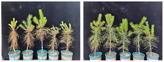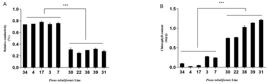 Moreover, the physiological performance indicated significant changes that could reflect the pines’ resistance level to PWN. For example, the chlorophyll content of P. tabuliformis in this study decreased by 0.86-fold in the susceptible lines compared to the resistant lines. Similarly, the chlorophyll a and chlorophyll b content of P. sylvestris at 30 d of B. xylophilus inoculation were reduced by 38.6% and 50.9% compared to the control, respectively [11]. Further, pathogen infection could greatly damage the host cell membrane by increasing membrane lipid peroxidation and altering membrane permeability. A study on P. sylvestris showed that the MDA content in the infected plants with B. xylophilus was 449% higher than the control. Comparably, the REL and MDA content of the susceptible trees in the present study increased by 1.56-fold and 1.32-fold compared to that of the resistant plant (Figure 3). The physiological level could thus well evaluate the resistance process of pine germplasms to PWN.