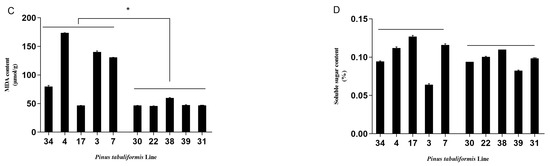 Physiological results of the P. tabuliformis germplasms after inoculation with B. xylophilus for 30 d. Note: (A), relative conductivity; (B), total chlorophyll content; (C), malondialdehyde content; (D), soluble sugar content. The left five lines are the sensitive to PWN type and the right five lines are the resistant to PWN type. * and *** represent the significant difference between the resistant lines and the susceptible lines at p < 0.05 and p < 0.001, respectively.