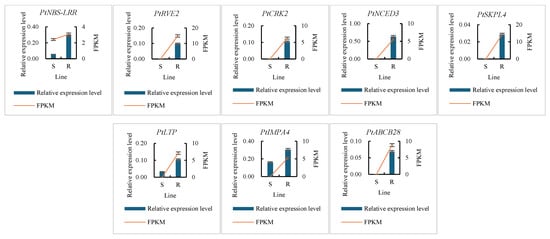The expression patterns of eight genes in the S and R groups of P. tabuliformis inoculated by PWN for 30 d. S, pool of the sensitive lines; R, pool of the resistant lines. The left ordinate means the RT–PCR results marked in the bar chart. The right ordinate means the RNA-sequencing data marked with red lines.