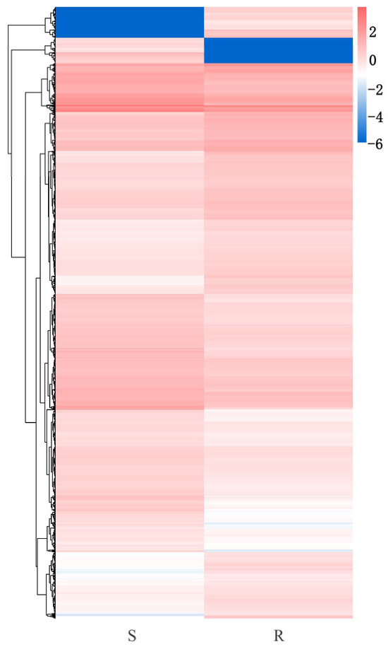 Cluster diagram of S_vs_R DEGs. The ordinate represents the DEGs and the clustering results of the genes. The color lines indicate the expression level [log10 (FPKM + 0.000001)] of the genes from low (red) to high (blue).