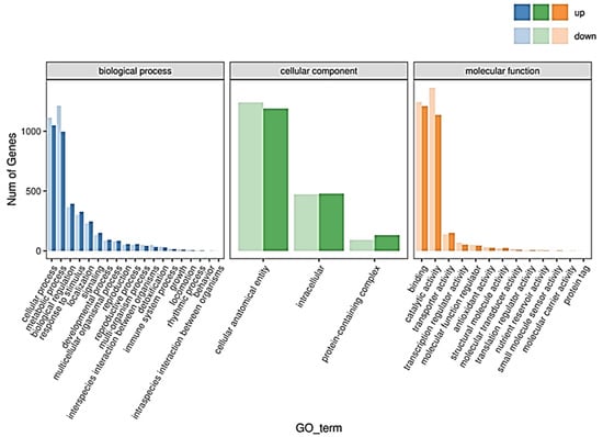 A total of 5869 DEGs were annotated in the database, including 4780 genes in the GO database (Table 2). The GO annotations categorized the DEGs into three major groups: in biological processes, they were mainly concentrated in the entries of cellular processes (1049 upregulated and 1114 downregulated genes in the R-pool) and metabolic processes (997 up- and 1213 downregulated genes in the R-pool); in cellular components, the DEGs were mainly focused on the cellular structural components (1190 upregulated and 1242 downregulated genes in the R-pool); in molecular functions, the DEGs were mainly concentrated in the entries of binding (1210 upregulated and 1244 downregulated genes in the R-pool) and catalytic activity (1137 upregulated and 1364 downregulated genes in the R-pool) (Figure 6).
