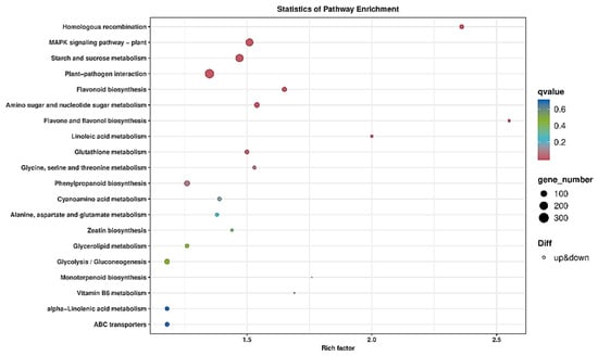 The enriched KEGG pathways of S_vs_R DEGs. The abscissa indicates the name of the pathway, and the ordinate is the rich factor. The color of the circle represents the q value. The size of the circle indicates the number of genes enriched in the pathway.