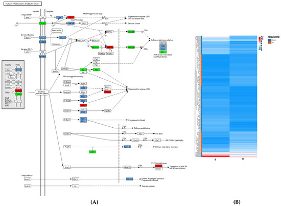 S_vs_R DEG-mediated plant–pathogen interaction pathway (A) and expression (B). The red boxes in panel (A) represent up-regulated DEGs, while the green boxes represent down-regulated DEGs, and the light blue boxes represent up- and down-regulated DEGs. The red boxes in panel (B) represent up-regulated DEGs, and the blue boxes represent down-regulated DEGs.