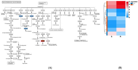 S_vs_R DEG-mediated monoterpenoid biosynthesis pathway (A) and expression (B). The red boxes in panel (A) represent up-regulated DEGs, and the light blue boxes represent up- and down-regulated DEGs. The red boxes in panel (B) represent up-regulated DEGs, and the blue boxes represent down-regulated DEGs.