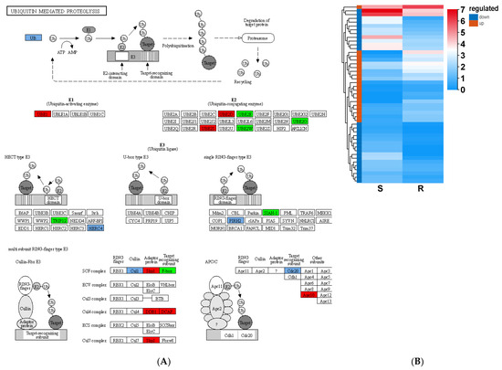 Ubiquitin mediated proteolysis pathway of the S_vs_R DEGs (A) and expression (B). The red boxes in panel (A) represent up-regulated DEGs, while the green boxes represent down-regulated DEGs, and the light blue boxes represent up- and down-regulated DEGs. The red boxes in panel (B) represent up-regulated DEGs, and the blue boxes represent down-regulated DEGs.