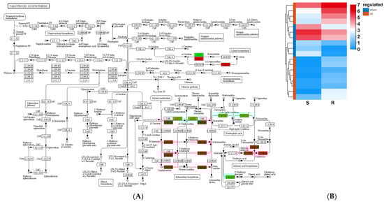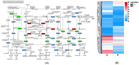 S_vs_R DEG-mediated phenylpropanoid biosynthesis pathway (A) and expression (B). The abscissa indicates the name of the pathway, and the ordinate is the rich factor. The red boxes in panel (A) represent up-regulated DEGs, while the green boxes represent down-regulated DEGs, and the light blue boxes represent up- and down-regulated DEGs. The red boxes in panel (B) represent up-regulated DEGs, and the blue boxes represent down-regulated DEGs. The color of the circle represents the q value. The size of the circle indicates the number of genes enriched in the pathway.