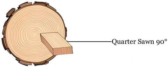 The experiment selected 90-degree radial cut boards of Sitka spruce (Picea sitchensis (Bong.) Carr.) and Indian rosewood (Dalbergia latifolia Roxb.) from Hunan kepma Musical Instrument Manufacturing Co., Ltd., Changsha, China, which are used as materials for musical instruments without visible defects such as cracking, deformation, decay, and discoloration. The experiment specimens are all heartwood and 400 × 25 × 10 (L × M × H). The cutting position of the specimen is shown in Figure 1. The surface of each sample was processed using a planer, and there were 12 samples for each type of wood. The mean densities of the Sitka spruce specimens at moisture contents of 2%, 7%, and 12% are 368.2 kg m−3, 386.3 kg m−3, and 404.3 kg m−3, respectively. The mean densities of the Indian rosewood specimens at moisture contents of 2%, 7%, and 12% are 830.3 kg m−3, 871.0 kg m−3, and 911.7 kg m−3, respectively. The annual ring width of spruce is about 0.57 mm, and the latewood rate is about 18.92%.