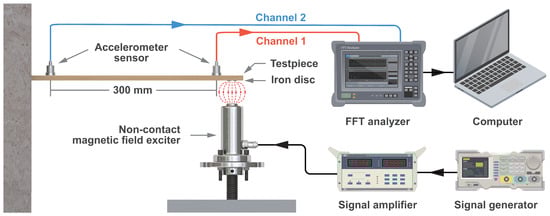 The experimental setup is shown in Figure 2, where the specimen was subjected to boundary conditions with one end free and the other end fixed. A circular iron plate with a mass of approximately was attached to the free end of the specimen. The signal generator (Model DH1301, Jiangsu Donghua Testing Technology Co., Taizhou, China) sent out a setting signal, which was amplified by the power amplifier (Model DH5872, Jiangsu Donghua Testing Technology Co., Taizhou, China) and transmitted to the non-contact magnetic field exciter (Model DH41020, Jiangsu Donghua Testing Technology Co., Taizhou, China). The signal generated by the magnetic exciter excited the circular iron plate below the free end specimen, driving the specimen to vibration. The gap between the magnetic exciter and the circular iron plate below the free end of the specimen was 5 . Two IEPE piezoelectric accelerometer sensors (INV9822, China Orient Institute of Noise & Vibration, Beijing, China) were placed 20 away from the free and fixed ends respectively and fixed to the specimen with epoxy resin glue. These sensors were connected to the FFT analyzer (CF-9200, Japan ONOSOKKI company, Yokohama, Kanagawa, Japan) through cables. Channel 1 (CH1) of the FFT analyzer was connected to the accelerometer sensor at the free end, and channel 2 (CH2) was connected to the accelerometer sensor at the fixed end. The FFT analyzer was used to obtain vibration data of the specimen, which were then processed and analyzed by a computer. The test method was based on ASTM D6874-12 standard [34].