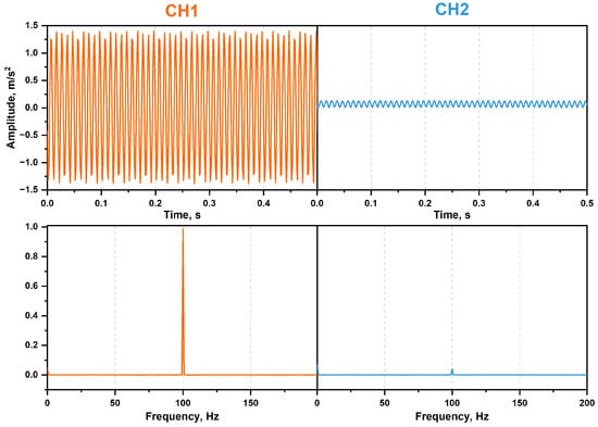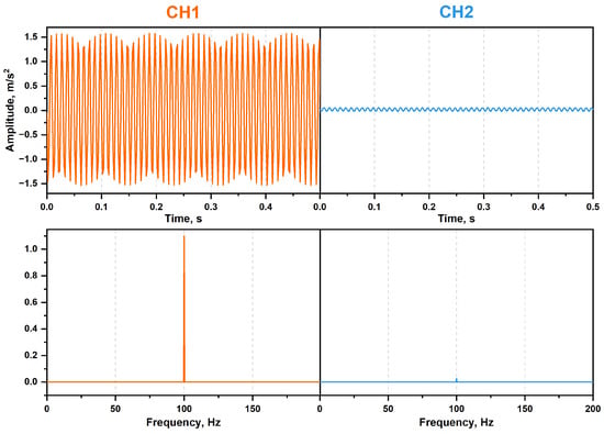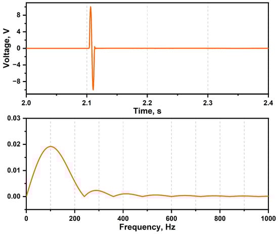 Figure 11 shows the time- and frequency-domain waves by the signal generator in burst mode. The gate control was set to N cycles, the number of cycles was 1, the waveform type was sine wave, and the output frequency was 100 . From the figure, it can be seen that the time-domain signal underwent brief oscillates. In the frequency-domain, the main lobe was symmetrically centered around 100 , with energy concentrated at this frequency. The side lobes exhibit lower amplitudes and gradual attenuation, showing the typical characteristics of a sine function. The pulse signal was transmitted through the magnetic exciter, causing a single vibration of the specimen.