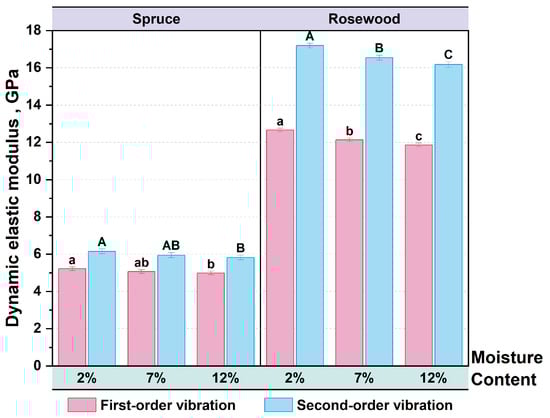 Dynamic elastic modulus of first-order and second-order vibration modes of specimens with different moisture contents, where bars sharing same letter (e.g., a and ab): no significant difference; others (e.g., A and B): significant.