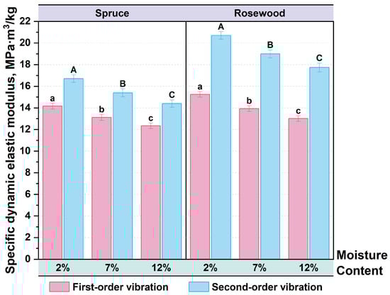 Specific dynamic modulus of first-order and second-order vibration modes of specimens with different moisture contents, where bars sharing no same letter (e.g., A, B and C): significant difference.