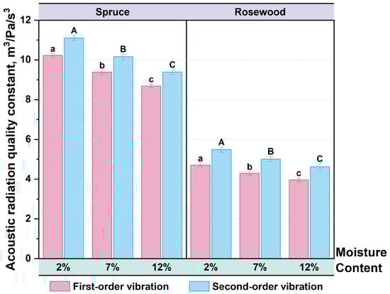 Acoustic radiation quality constant of first-order and second-order vibration modes of specimens with different moisture contents, where bars sharing no same letter (e.g., A, B and C): significant difference.