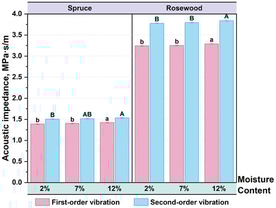 Acoustic impedance of first-order and second-order vibration modes of specimens with different moisture contents, where bars sharing same letter (e.g., A and AB, or b and b): no significant difference; others (e.g., A and B): significant.