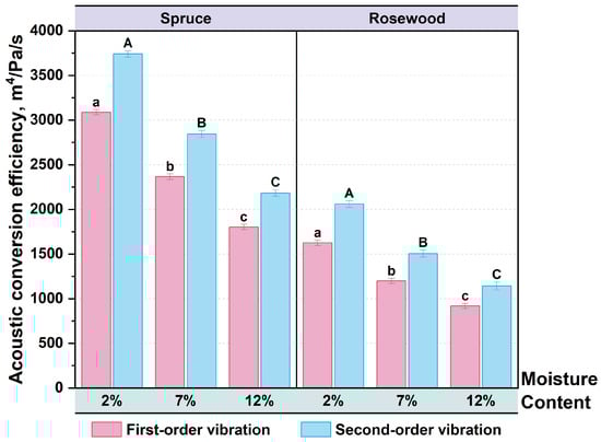 Acoustic conversion efficiency of first-order and second-order vibration modes of specimens with different moisture contents, where bars sharing no same letter (e.g., A, B and C): significant difference.