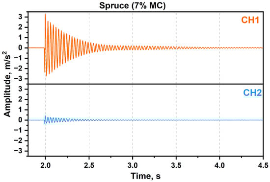 Figure 12 shows the time-domain signals of a spruce specimen with a moisture content of 7% excited by the pulse at the transmitting end (CH1) and receiving end (CH2). It was found that when the specimen was in a stationary state, it was suddenly excited by a pulse signal. The signals at the transmitting and receiving ends of the specimen suddenly increase to their maximum, and then gradually decay periodically to a stationary state. Moreover, the vibration intensity at the receiving end of the specimen decreases significantly compared to the transmitting end.