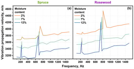 Figure 13a shows the relationship between vibration propagation velocity and frequency for spruce specimens with different moisture contents. It can be observed from the figure that, except for the resonance frequency point, the vibration propagation velocity increased with signal frequency. The vibration propagation velocity at 1500 of the specimen with a moisture content of 2% increased by 6.22% compared to 100 . Similarly, specimens with moisture contents of 7% and 12% showed an increase in vibration propagation velocity of 6.63% and 8.93%, respectively. In addition, at the same frequency, the vibration propagation velocity of specimens with a moisture content of 2% increased by 12.68% to 19.99% compared to those with a moisture content of 12%.