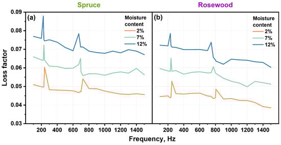 - With the increase in moisture content, the loss factor of the spruce and rosewood specimens significantly increased. Additionally, as frequency increased, the loss factor of the spruce and rosewood specimens showed a decreasing trend. At the first-order and second-order resonance frequencies, the loss factor of spruce and rosewood significantly increased. The increase in the loss factor of specimens at the first-order resonance frequency was higher than that at the second-order resonance frequency.