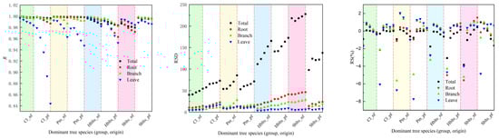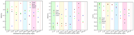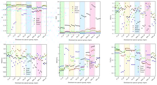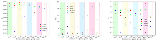 The samples were divided into five groups for the synchronous modeling and testing to obtain cross-modeling and testing accuracy values for each dominant tree species (group and origin), as shown in Figure 1 and Figure 2. For modeling accuracy (Figure 1), the overall R value exceeded 0.9860, the RSD values ranged from 40.44 to 225.66, the RS and MSE values were within ±1%, the RMA values remained below 5.5%, and the EA values surpassed 99.50%. Specifically, for the roots, the R value exceeded 0.9800, the RSD values were between 9.80 and 45.00, the RS and MSE values were within ±2%, the RMA values stayed below 5%, and the EA values surpassed 99.60%. For the branches, the R value was greater than 0.9920, the RSD values ranged from 6.50 to 25.50, the RS and MSE values were within ±1%, the RMA values remained below 4%, and the EA values exceeded 99.70%. For the leaves, the R value surpassed 0.9550, the RSD values ranged from 3.90 to 14.70, the RS and MSE values were within ±0.7%, the RMA values stayed below 5%, and the EA values exceeded 99.50%. These results indicate that the cross-modeling fitting accuracy for each dominant tree species (group and origin) was high, particularly for branches.