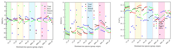 By constructing compatible carbon storage models for the total volume, branches, roots, leaves, and trunks and comparing these with carbon storage calculations using a standard carbon content rate (e.g., 0.50), the former exhibits higher predictive accuracy [25]. Other studies have shown that using a fixed carbon content rate to calculate carbon storage in Cunninghamia lanceolata forests can result in errors of up to 5.4% compared with actual measurements [26]. Errors arise because a fixed carbon content obscures variations in carbon content across different species and organs, leading to significant deviations. Widagdo et al. also found significant differences in carbon content among different origins and the organs of larch trees. Therefore, carbon storage models developed separately for different origins, parts, and tree species (groups) to accurately estimate the forest carbon storage.
