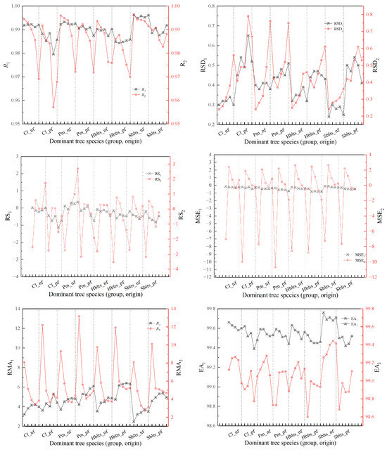 Accuracy indicators for modeling in cross-modeling. The x-axis represents the categorical species groups (group and origin); the data points are shown as separate markers without connecting lines to avoid misinterpretation of continuity. The evaluation indicators RS, MSE, RMA, and EA are expressed as a percentage (%), while R and RSD are dimensionless. The species groups include the following: Cl_pf = Cunninghamia lanceolata plantation, Cl_nf = natural Cunninghamia lanceolata, Pm_pf = Pinus massoniana plantation, Pm_nf = natural Pinus massoniana, HBlts_pf = hard broad-leaved tree species plantation, HBlts_nf = natural hard broad-leaved tree species, Sblts_pf = soft broad-leaved tree species plantation, and Sblts_nf = natural soft broad-leaved tree species.