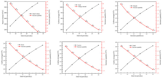 The calculations indicate that the current volume in the case area is 21.0521 million cubic meters, and the carbon storage is 7.3238 million tons. The carbon storage capacities of the stand branches, roots, leaves, and trunks were 0.1527, 0.2128, 0.12376, and 0.24311 million tons, respectively. Given interval periods of 5, 10, 15, 20, 25, and 30 years, without considering the theoretical logging volume, the calculated volumes and carbon storage, along with their corresponding changes for different interval periods, are shown (Figure 5). It can be observed that both the volume and carbon storage of each part increase with the extension of the interval period, but the magnitude of the increase shows a similar directional change, primarily because of the resistance induced by the stand volume estimation model.