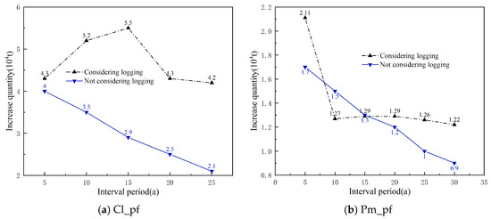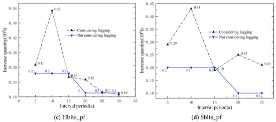 Using the simulation calculation method, the theoretical logging volumes for each dominant tree species (group and origin) over different interval periods were calculated, and the increases were then determined (Figure 6). It is evident that, without considering the logging volume, the increases (carbon sequestration) for each dominant tree species (group, origin) decrease with the lengthening of the interval period, especially apparent in Cl_pf and Pm_pf. When considering the logging volumes, the increases for each dominant tree species (group and origin) fluctuated with the extension of the interval period, and the increases for all four types of plantations at the time of the main felling were higher than those without logging volume, particularly for Cl_pf, Pm_pf, and Sblts_pf.