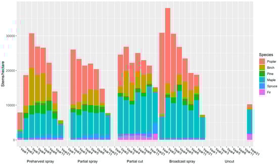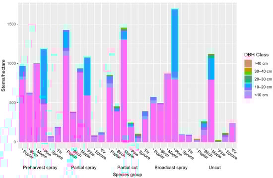 The lead overstory species (>20% in density) varied by treatments: pine, poplar, and maple in the preharvest spray and partial spray; maple and poplar in the partial cut; pine and maple in the broadcast spray; and maple in the uncut (Table 2; Figure 4). The overstory composition by BA was slightly different, due to relatively small maple trees. Among the four harvest treatments, the proportion of pine trees with a DBH ≥10 cm was highest in the preharvest spray (59%), followed by the broadcast spray (52%), partial spray (45%), and partial cut (18%) (Figure 4). The proportion of poplars reaching DBH ≥10 cm was 14%, 8%, 19%, and 12%, respectively, in the four harvest treatments.