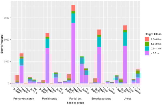 At year 21 postharvest, the understory tree density in the regeneration layer was the highest in the partial cut and lowest in the preharvest spray, and did not differ significantly among treatments (Table 1). Maple trees were the most abundant, ranging from 60% in the preharvest spray and partial cut to >80% in the postharvest broadcast spray, and were mostly under 50 cm in height (>60%) (Figure 2). Poplar trees were more abundant in the uncut, while other species, except for pine, appeared to have higher densities in the partial cut. Averaged among all species, understory trees were taller in the preharvest spray (Table 1 and Figure 2).